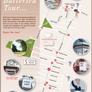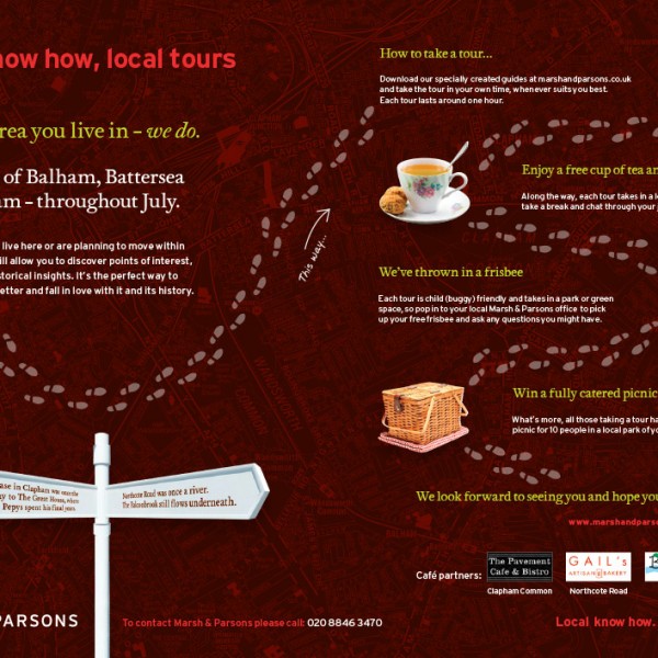 Hour long, self guided, walking tours were created in three target areas – Clapham, Balham and Battersea. The free guides were downloadable from the web and available in local stores. Each one offered participants a free gift & cup of tea and cake at a café en route.